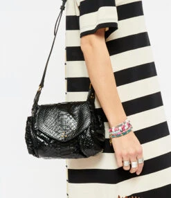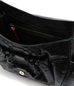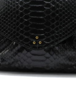 Sac besace en cuir de python noir avec deux poches plaquées élastiquées sur les côtés. Bandoulière réglable, non amovible. Fermeture par rabat aimanté. Intérieur doublé avec une poche plaquée zippée.