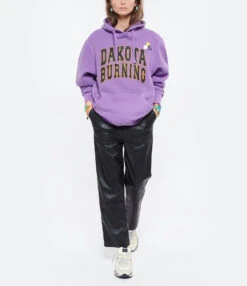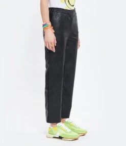 Pantalon droit en cuir vegan noir. Taille élastiquée. Deux poches fendues et deux poches plaquées à l’arrière. Coupe droite. Base droite coupée à cru.