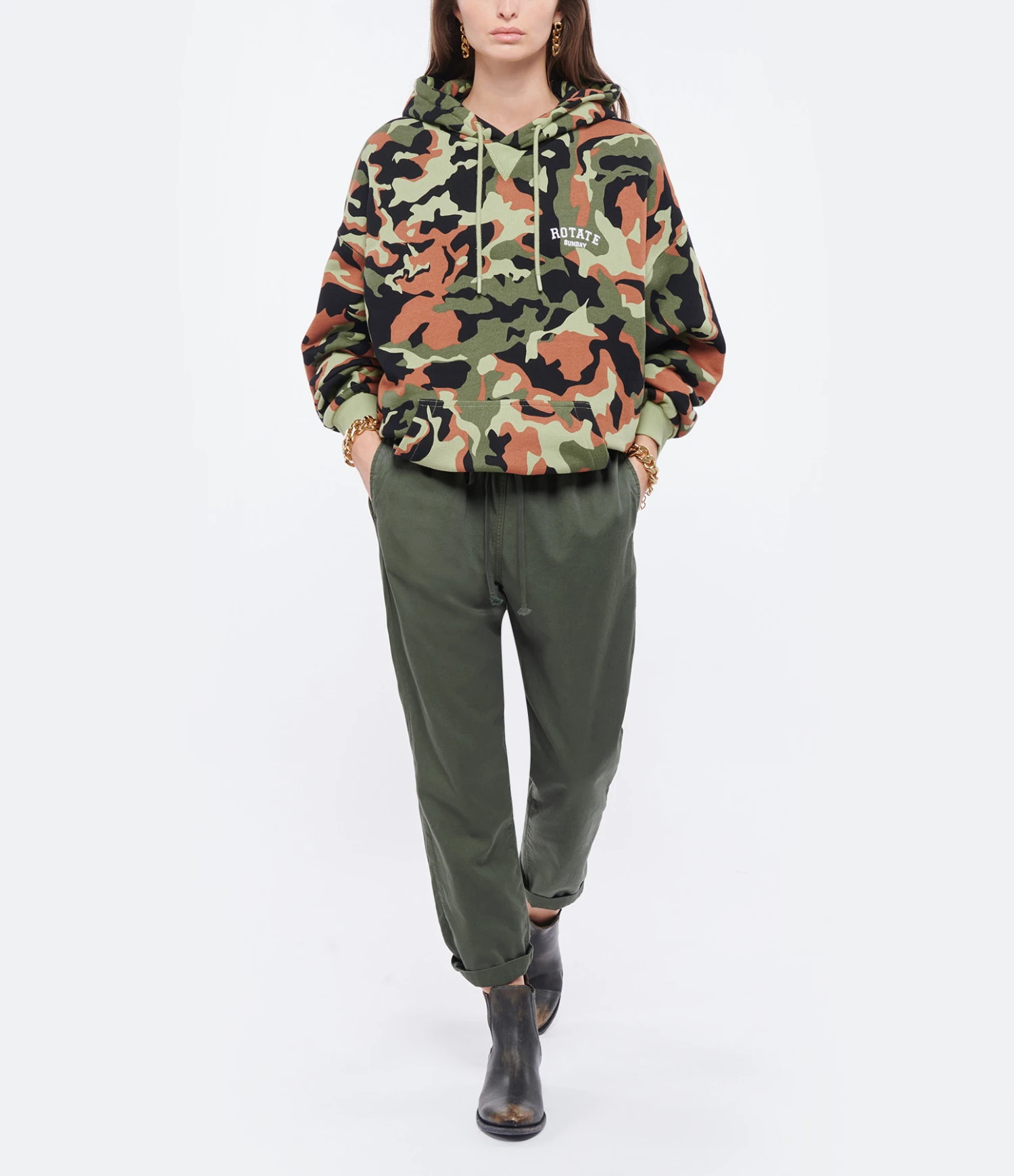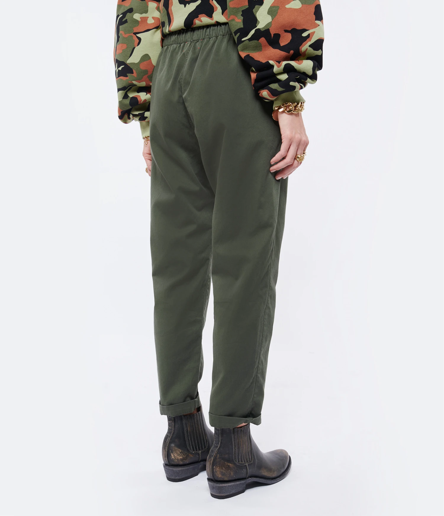 Pantalon en coton vert foncé. Taille élastiquée avec liens de serrage. Deux poches italiennes. Coupe droite.