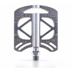 La plate-forme à deux côtés est une extrusion d’aluminium découpée CNC. Elle possède beaucoup d’espaces pour éliminer les points de pression – environ 100 mm de large et 100 mm de long. Il y a 12 goupilles de traction remplaçables de chaque côté de la pédale pour offrir une excellente adhérence même lorsqu’elle est mouillée. Sont incluses des goupilles arrondies avec les pédales afin de ne pas endommager les chaussures de ville, mais elles sont facilement remplacées par des goupilles pointues plus agressives.