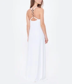 Robe longue blanche fluide. Coupe droite. Base droite. Décolleté en V. Bretelles épaules fines en tissu. Bretelle centrale avec anneaux effet écaille de tortue dans le dos.