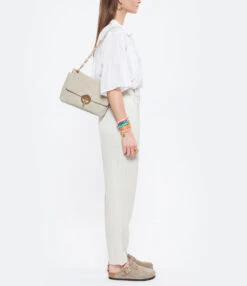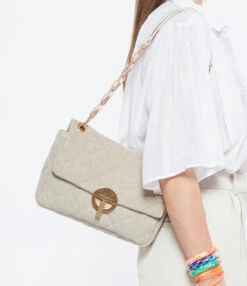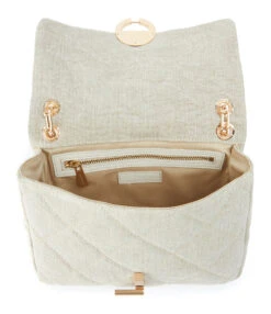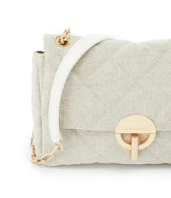 Sac bandouliÚre à rabat en lin matelassé beige. BandouliÚre en chaßne et poignet en cuir, possibilité de porter en double chaßne Fermeture par boucle métallique. Intérieur doublé en coton avec une poche zippée et une poche plaquée.